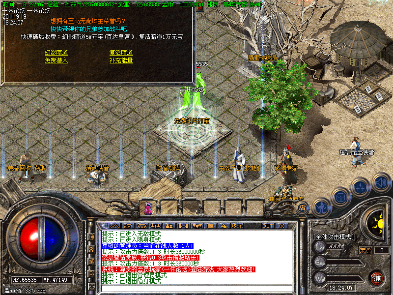 【新手专场】:开放新手天堂(土城右下角340 340进入),此地图进入后是边免费泡点升级(每秒高达20000经验),而且还可以打怪获得特殊戒指→怒血皓月→黄金皓月→粉红皓月→噬血破魂套等。