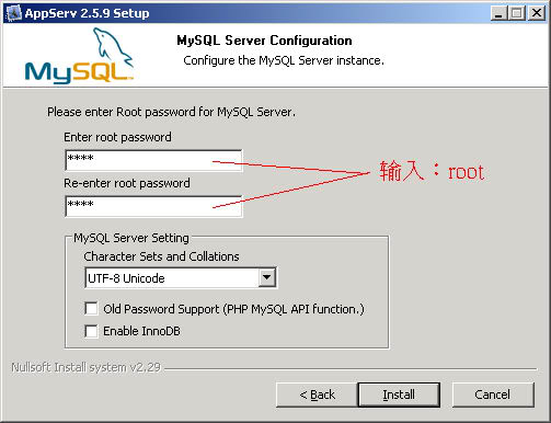 安装 AppServ 时,请输入密码 root : 图1