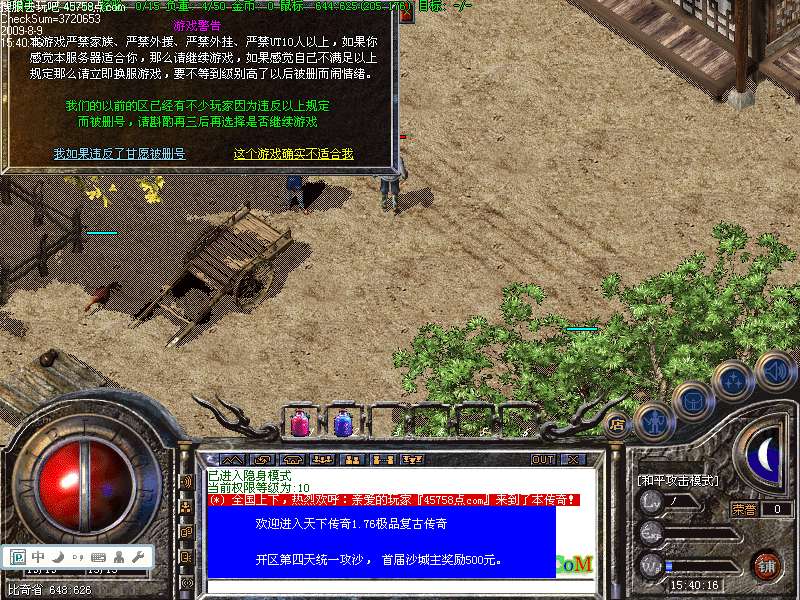 提示:本服务器拒绝家族,禁止外援!号角爆率1/5,开区第四天统一拿沙,占沙行会奖励3000元宝!