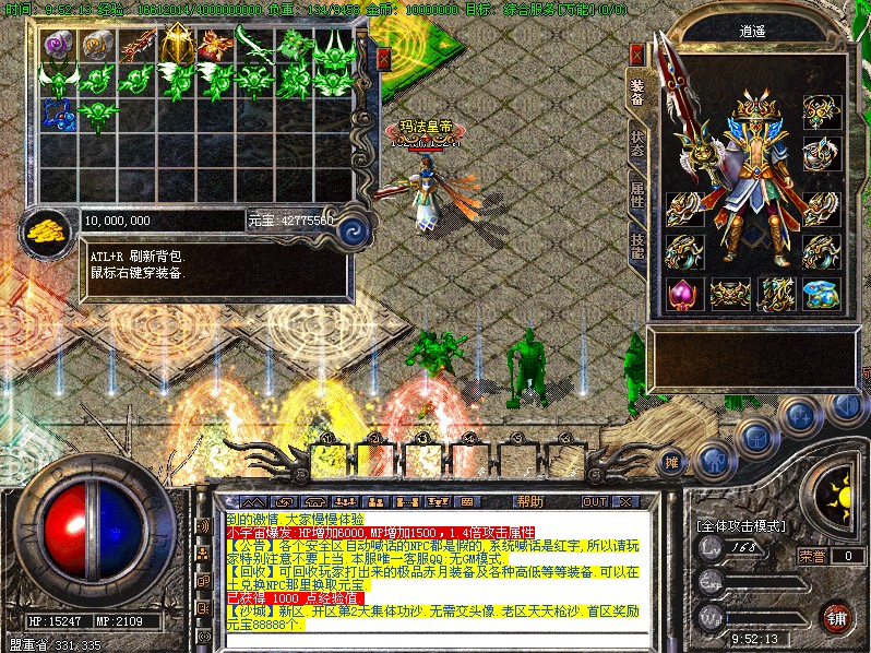 5:本服最高攻击为幸运10套,土城地图开通升级幸运项链NPC,可以升级一点幸运,有几率失败,有一定难度,请玩家慎重选择。