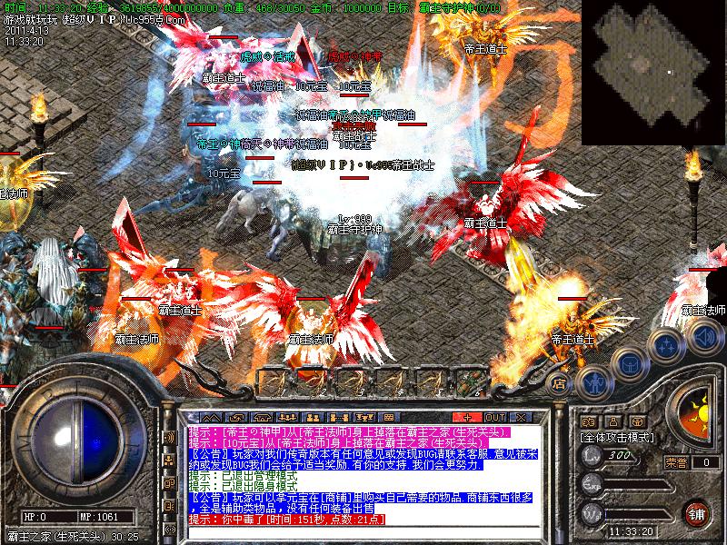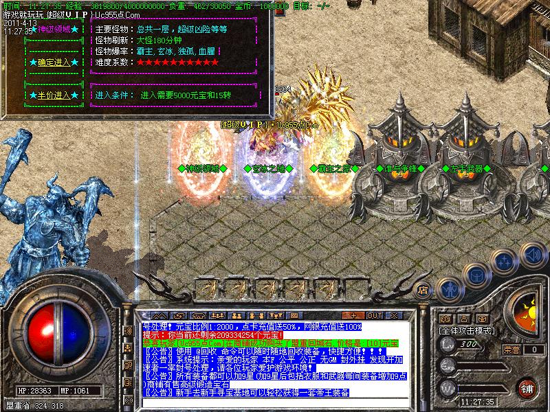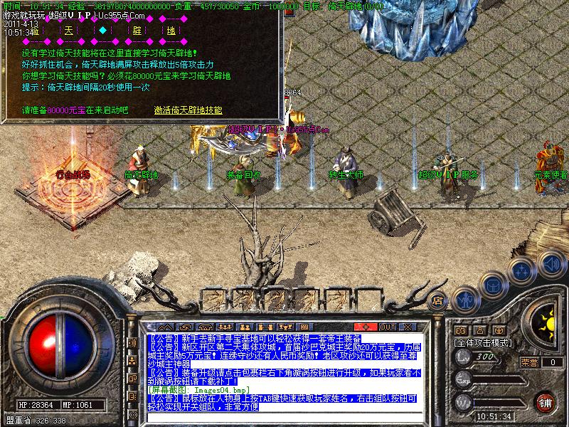 新区开区第二天集体攻城,首届沙巴克城主奖励20万元宝,历届城主奖励5万元宝!连续守沙还有人民币奖励!老区攻沙还可以获得至尊沙城主神器本服唯一的网站:装备升级请点击包裹栏右下角漩涡按钮进行升级,如果玩家看不到漩涡按钮请下载补丁!