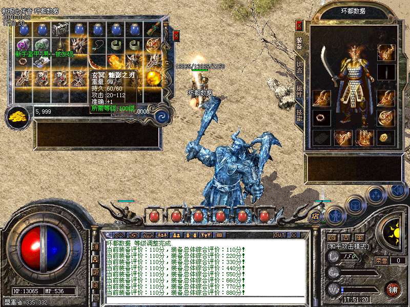 【装备评价系统】:游戏可的每一件装备,系统根据装备的等级,属性,都会作出一个评价并评分,玩家在更换身上的装备,系统会提示当前单件装备的分值及全身装备评价总分,同时,全服玩家的装备评价有排名,玩家可以通过点击游戏界面的对应按钮查看。一身极品装备,能让全服玩家羡慕!