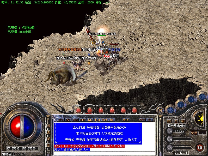 游戏指南:初级新手先到矿区挖矿获得金币且可以很快升到45级,后进入尸王殿获得初级技能.然后进入新手天堂___魔龙血域.这儿的战将类怪物可以轻松获得雷霆和强化雷霆类装备.遇上魔龙教主还有机会获得战神.开天
