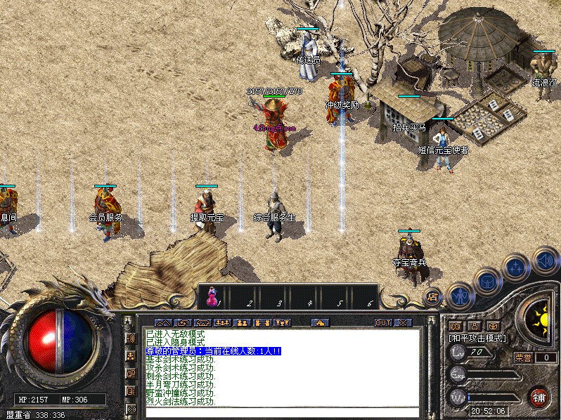 特色:行会战系统。 系统每两小时进行一次行会战争,战争地图30秒加300万经验和杀死每只怪+500点荣誉值,刷出的怪能爆顶级,激情无限,请大家踊跃参加。